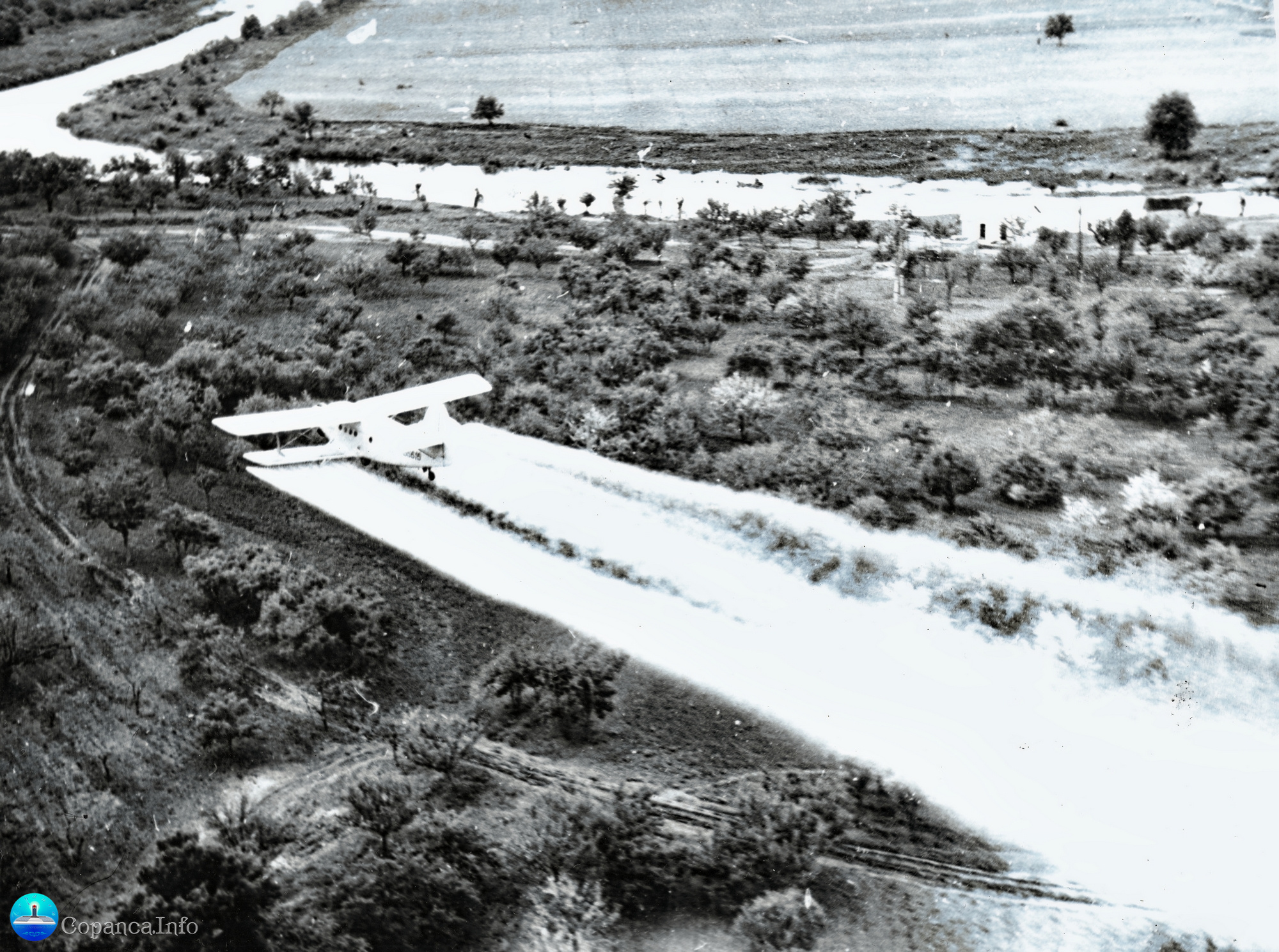 Pentru combaterea dăunătorilor de grădini se folosește aviațiaFoto: Muzeu Copanca - Anii 1960